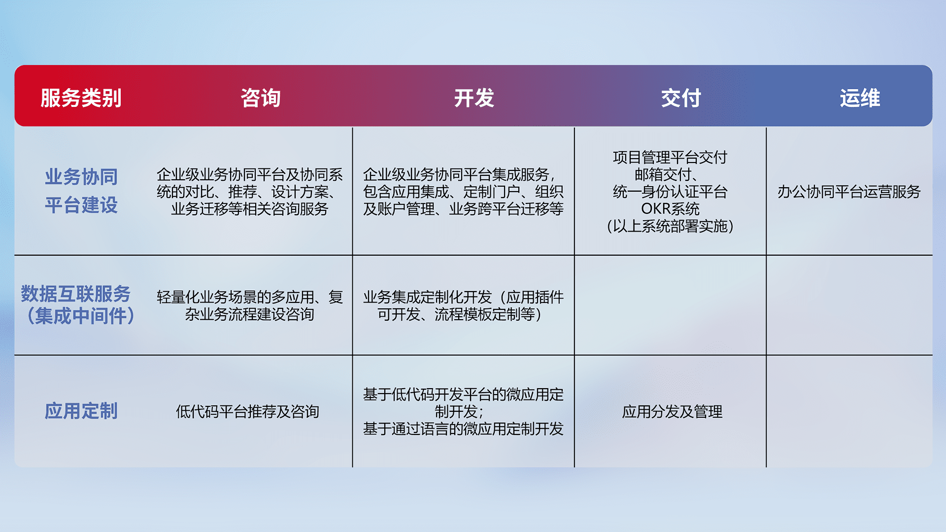 针对钉钉、、企微、、、IDaas等平台级产品提供产品的规划、、方案、、、交付、、、定制化开发等服务,,,,实现如统一协同办公、、、、智能客户服务、、混合会议管理、、、智能数据查询、、、、等业务场景,,实现数字化转型。。。